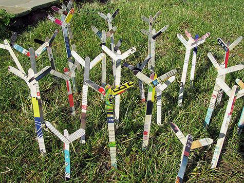 Hundreds of crosses made of plant labels covered with paper from The Big