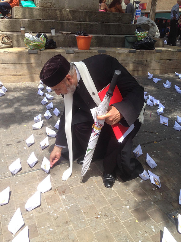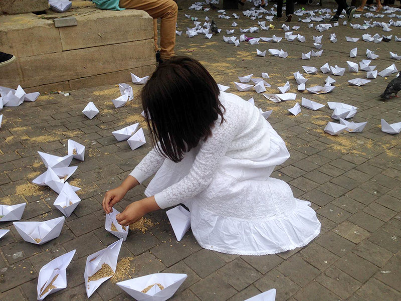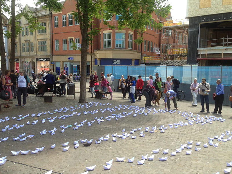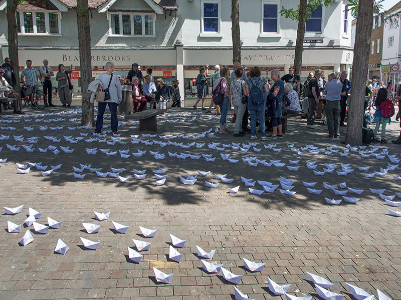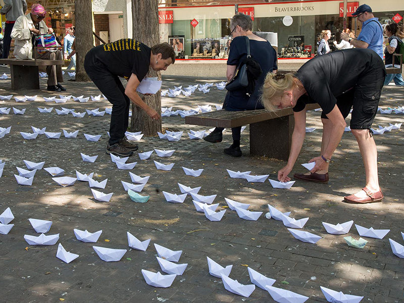 make hundreds of tiny paper boats representing the thousands of people who